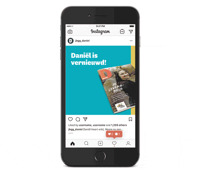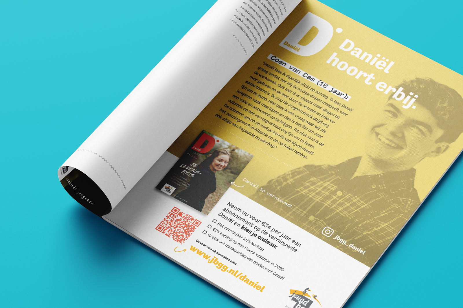 Voor de vernieuwde Daniël hebben we een crossmedia campagne opgezet. Dat betekent dat we zowel offline als online middelen hebben gebruikt om de campagne onder de aandacht te brengen. De slogan 'Daniël hoort erbij' spreekt beide leeftijdsgroepen in de doelgroep op hun eigen manier aan. De ouderen bereiken we met advertenties in papieren media, de jongeren met name op Instagram en Facebook. Bijzonder is het speciale proefnummer van 12 pagina’s op krantenpapier dat op meer dan 30.000 adressen is verspreid bij abonnees van verschillende kerkbladen.